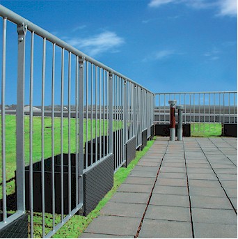 Geländersystem ist gleichzeitig eine Anschlageinrichtung.